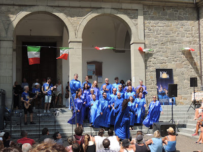 Day 3 at Porretta was not a vintage one. The highlight of the evening were the Blues Paddlers, also known as Samuel and Davis. There was an outcry earlier in the year with Sam Moore's wife criticising them for ripping off the style and performance of the great Sam and Dave. No doubt as a result of this they changed their name, although probably not their act. I saw Sam and Dave outshine everyone, even Otis himself, when the Stax Volt show played Croydon in 1967. These two are not in the same league but they are fun to watch and pretty good vocally as well. They kicked off with two Sam and Dave originals, 'Soul Man' and 'Hold On I'm Coming' wearing red shirts and dashing around the stage in a frenzy. Davis then continued solo with Wilson Pickett's 'Don't Let The Green Grass Fool You' before Samuel returned, wearing an ornate military style jacket to sing 'A Change Is Gonna Come'. Davis came back on stage, similarly dressed as they performed several Sam and Dave style numbers from their new album 'That's What We Do'. These included 'Power Of A Woman's Love', 'You Didn't Want Me To Have It' and 'Rock With Me Baby'. For their final number they returned carrying large paddles which they used to good effect on inter actions with the audience as they sang the title song from their album. This was a strong set and they were well supported by the excellent Bo-Keys, with the addition of the veteran Stax engineer and guitarist Bobby Manuel, who then received a Sweet Soul Music award from festival supremo Graziano Uliani and MC Rick Hutton (see below). Earlier there was a brief appearance by the Over Soul Marching Band from Perugia followed by a decent set of Soul and blues by Portland, Oregon based Curtis Salgado. Curtis has a good voice, as he showed on a couple of O V Wright songs 'I Don't Need Nobody But You' and 'I Was Born All Over', P J Proby's Cajun style song 'Niki Hoeky' and several of his own including'Let Me Give You Something', 'Summertime Life', '20 Years Of B B King', 'Walk A Mile In My Blues' and 'I Got Better Things To Lie About'. Next came a song we can all relate to: "The Longer I Live The OlderI Want To Get'. He finished with some rock and roll in the form of 'Slow Down'. This was a solid set with good work from his own band which included Eamonn Flynn on keyboards. I didn't watch much of the later acts as the packed arena was uncomfortable but from what I saw the next act Robin McKelle was more rock than Soul. And the Califfo Irish bar provided a good refuge from the busy street outside. Sunday at Porretta always starts with a gospel performance at the local church and a press conference which as usual was rather chaotic and largely just a photo op with some of the artists. The evening show comprises short sets by most of the artists but this year it included a set by Mighty Mo Rodgers which was excellent. Backed by the Luca Giordano band with Sax Gordon, whose mural in the town was finished this weekend, the soon to be 81 year old put on a set which was varied, with blues, soul and even some reggae, and very enjoyable. He began with 'Memphis Calling' from his new album of the same name, and included several new and original songs, including 'Sing For Your Supper', the bluesy 'Love Love Love', 'Working The Chitlin Circuit', 'Bad Luck Won't Let Me Be' and 'Bring Back Sweet Soul Music' which got Mo reminiscing about Memphis in the 60s and Stax. The reggae song 'Prisoners Of War' was excellent, as was one of his earliest recording 'Blues Is My Wailing Wall'. Mo has been around for many years - in fact he played keyboards on Brenton Wood's 'Gimme Little Sign' and produced an album by Sonny Terry and Brownie McGhee in the 70s - but he clearly remains at the top of his game. The set was great, as was the band. The remainder of the evening featured brief sets by Charlie Wood (3 numbers), Katrina Anderson (2 including a decent version of Dr Feelgood), the Blues Paddlers (2), Curtis Salgado (1) and Robin McKelle (2 including a melodramatic version of 'I'd Rather Go Blind'). It was good to see a couple of numbers from John Nemeth (photo below) who I missed the previous night. His voice and harp playing were very good on 'I Will Testify My Love' and 'I Can See Your Love Light Shine'. Finally it was the turn of Bobby Rush to take the stage with 'Chicken Heads', a duet with Mizz Lowe on 'Take My Love', and a rap about the unfairness of the justice system. As a finale most of the artists took to the stage for a joint effort on 'Take Me To The River'. Once again the Bo-Keys provided great backing. Porretta is over for another year. Will I return? I'm not sure as the number of original artists continues to decline and true Soul was lacking. But it's been a great few days as ever. Here are a few more photos of the festival. This is Eamonn Flynn and Conor Brady from the first evening. Here's one of the great Terrie Odabi. This is Mononeon, who I later learned is actually Dywane Thomas Jr, who was the bass player in the Marvell Thomas band which played at Porretta in previous years. Here is Scott Bomar, leader of the Bo-Keys. Here we have the Norman Sisters (Shontelle and Sharisse) who provided backing vocals with the Bo-Keys. Here's another photo of the great Bobby Rush. And here's another of Mizz Lowe. Here's John Nemeth receiving a specially produced painting with Rick Hutton. The Joy Gospel Choir sang at the local church on Sunday. Here's one of me with the great Hi keyboard player Archie 'Hubbie' Turner. Finally here's one of me with the Blues Paddlers aka Samuel and Davis. Apparently they don't have a preference about which name they are known by.